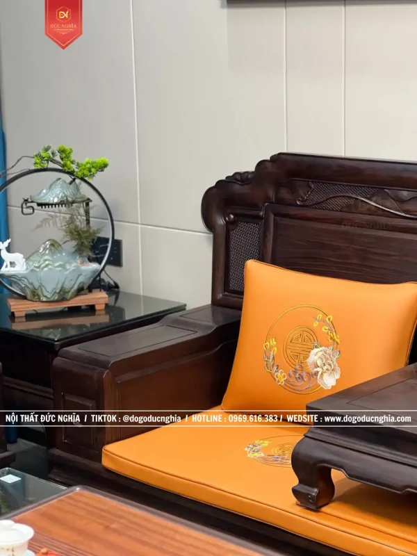 Đi kèm với khung ghế là đệm và gối da cao cấp có gam màu cam ấm áp, nổi bật giữa không gian trầm sang của gỗ tự nhiên. Lớp da dày mịn, bóng nhẹ được thêu họa tiết tinh xảo, thể hiện sự tỉ mỉ và tinh tế trong từng chi tiết nhỏ. Sự kết hợp hài hòa giữa chất liệu gỗ tự nhiên và da cao cấp không chỉ mang lại cảm giác êm ái, dễ chịu khi sử dụng mà còn tạo điểm nhấn thẩm mỹ, nâng tầm đẳng cấp cho toàn bộ không gian phòng khách.