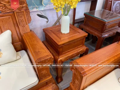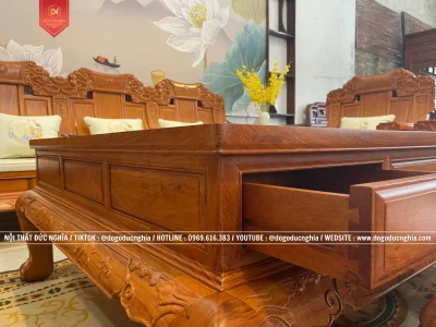 Xung quanh có ngăn kéo tiện lợi cất những vật dụng của phòng khách giúp không gian trở nên ngăn nắp. Phần ngăn kéo cũng được chau chuốt tỉ mỉ từng chi tiết nhỏ, kết cấu mộng gỗ thắt mang cá vô cùng chắc chắn.