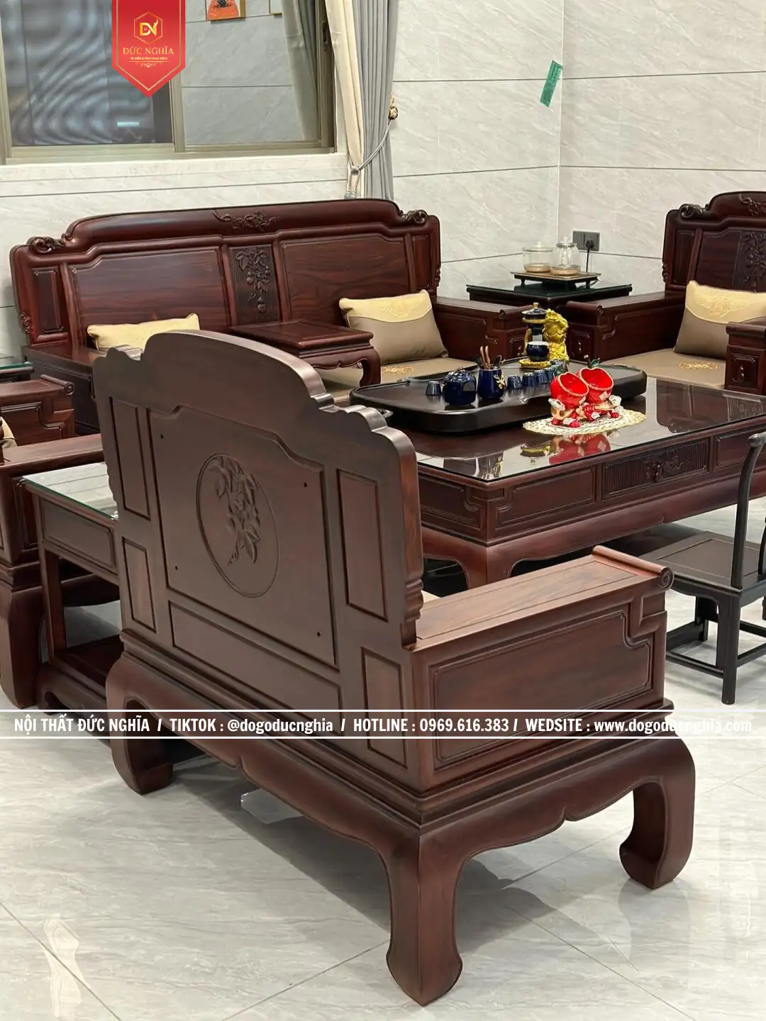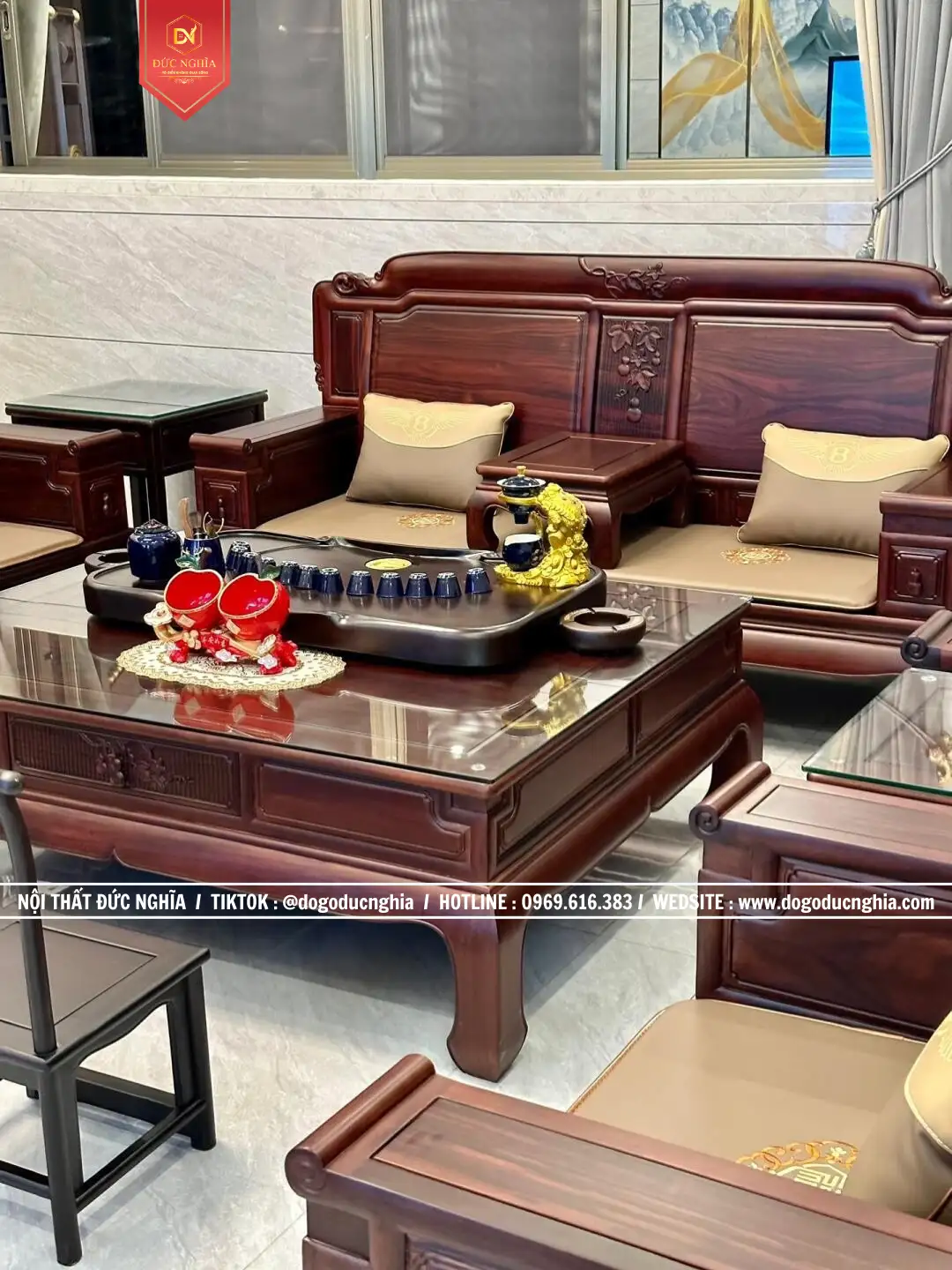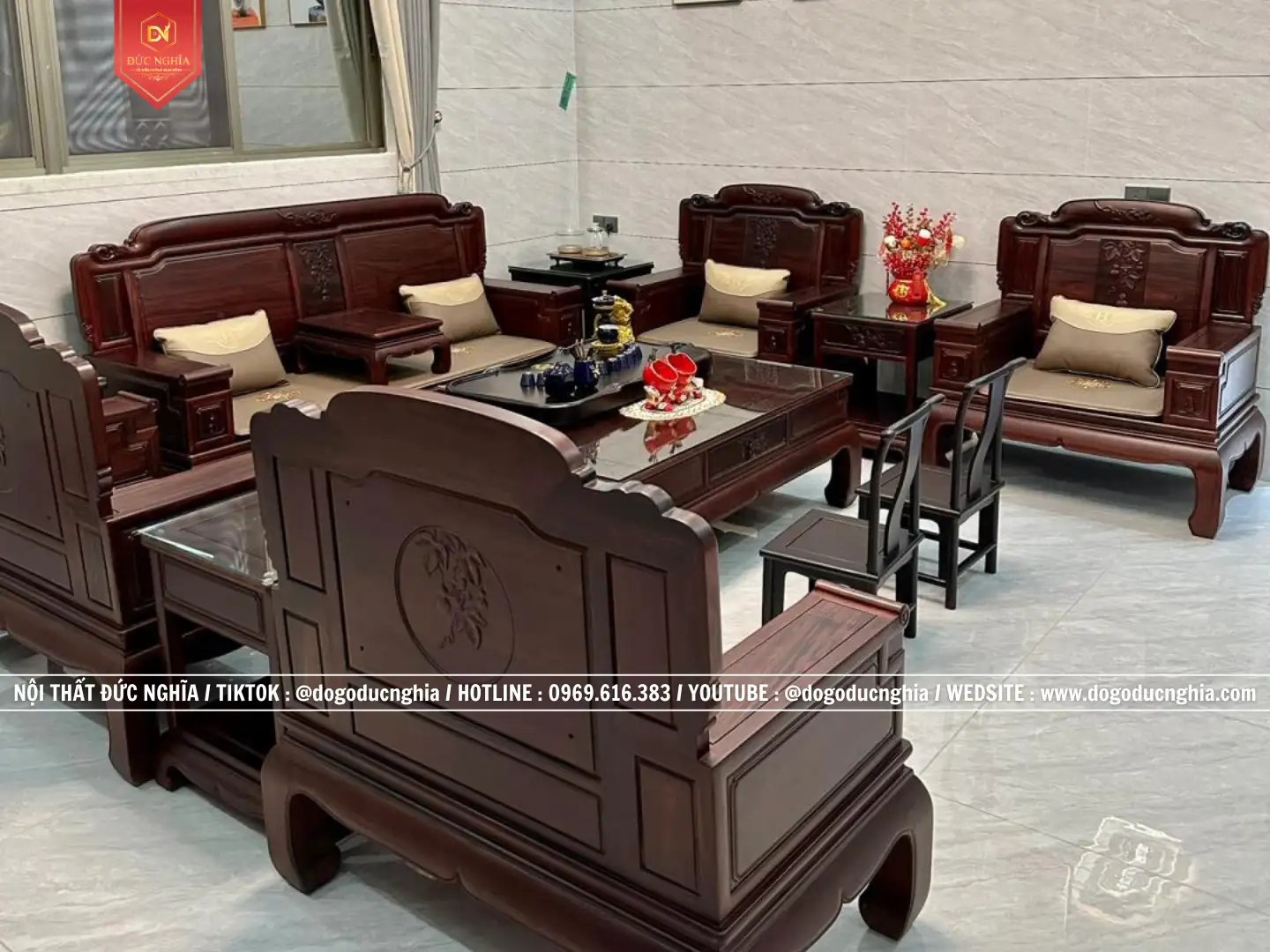 Bộ ghế Quốc Sắc Thiên Hương gồm 13 Món – chân 12. Phù hợp với không gian phòng khách từ 35m2