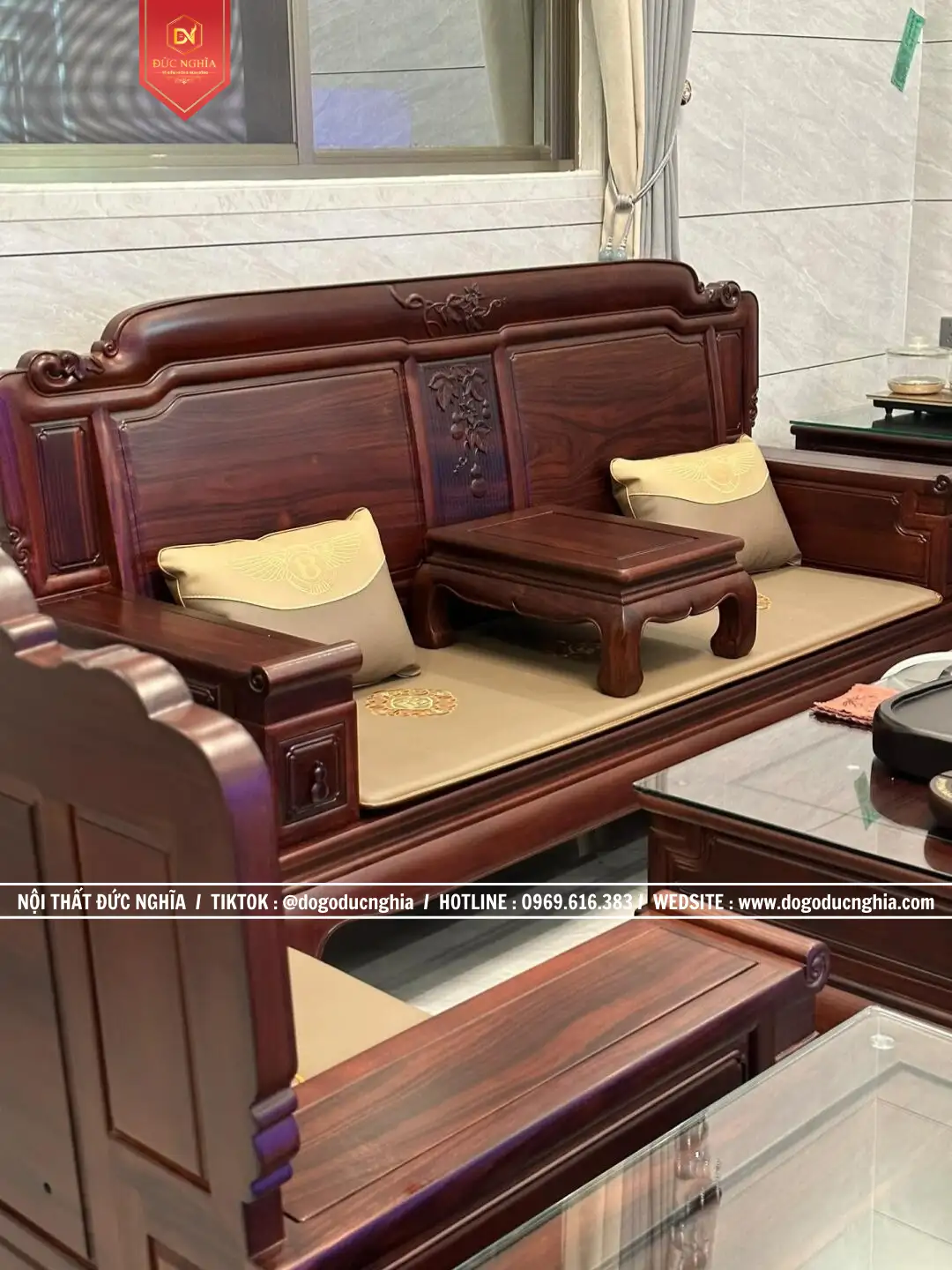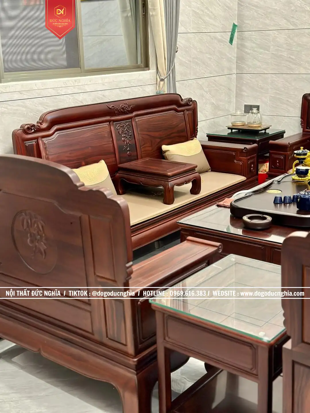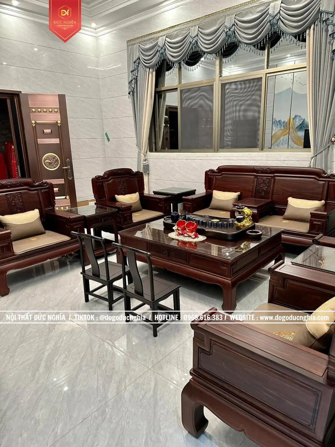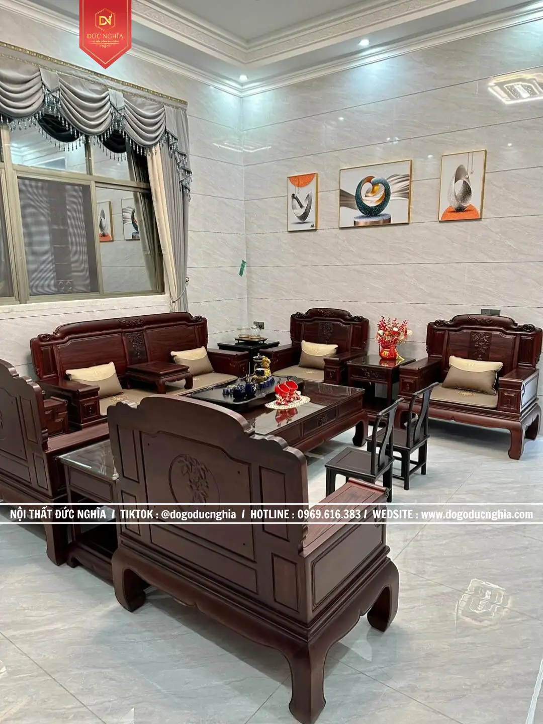 Bộ ghế Quốc Sắc Thiên Hương gồm 13 Món – chân 12. Phù hợp với không gian phòng khách từ 35m2
