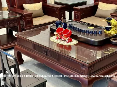 Chiếc bàn lớn với thiết kế tinh tế, chất liệu cao cấp thể hiện gu thẩm mỹ và đẳng cấp của gia chủ, là điểm nhấn chính trong tổng thể bộ ghế Quốc Sắc Thiên Hương.