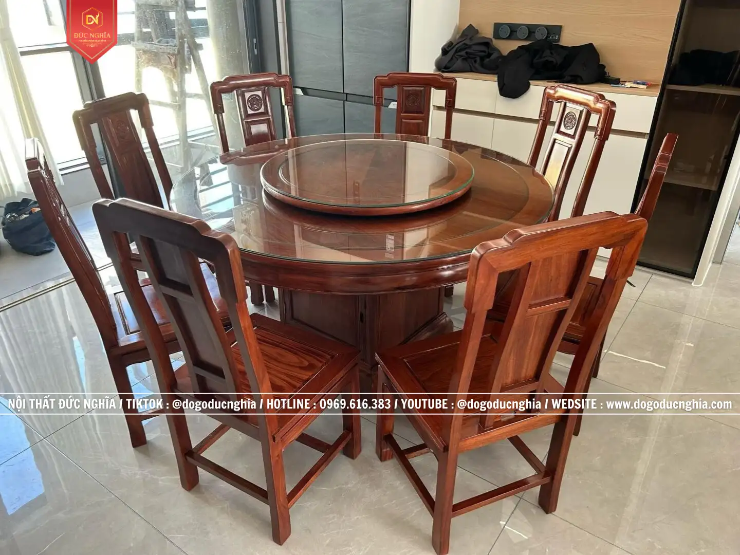 Không gian bếp liền kề được thiết kế đồng bộ với bộ bàn ghế ăn Triện, sử dụng bàn tròn có mâm xoay tiện nghi cùng 8 ghế, tạo cảm giác quây quần, ấm áp trong mỗi bữa cơm gia đình. Thiết kế bàn tròn giúp gắn kết các thành viên, đồng thời mâm xoay mang lại sự tiện lợi trong quá trình sử dụng. Sự đồng bộ giữa phòng khách và phòng ăn không chỉ nâng cao tính thẩm mỹ tổng thể mà còn thể hiện gu thẩm mỹ tinh tế, đẳng cấp của gia chủ.