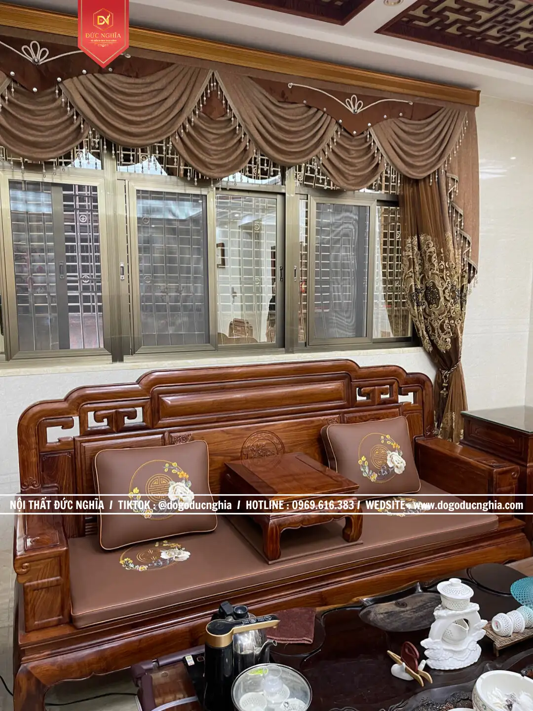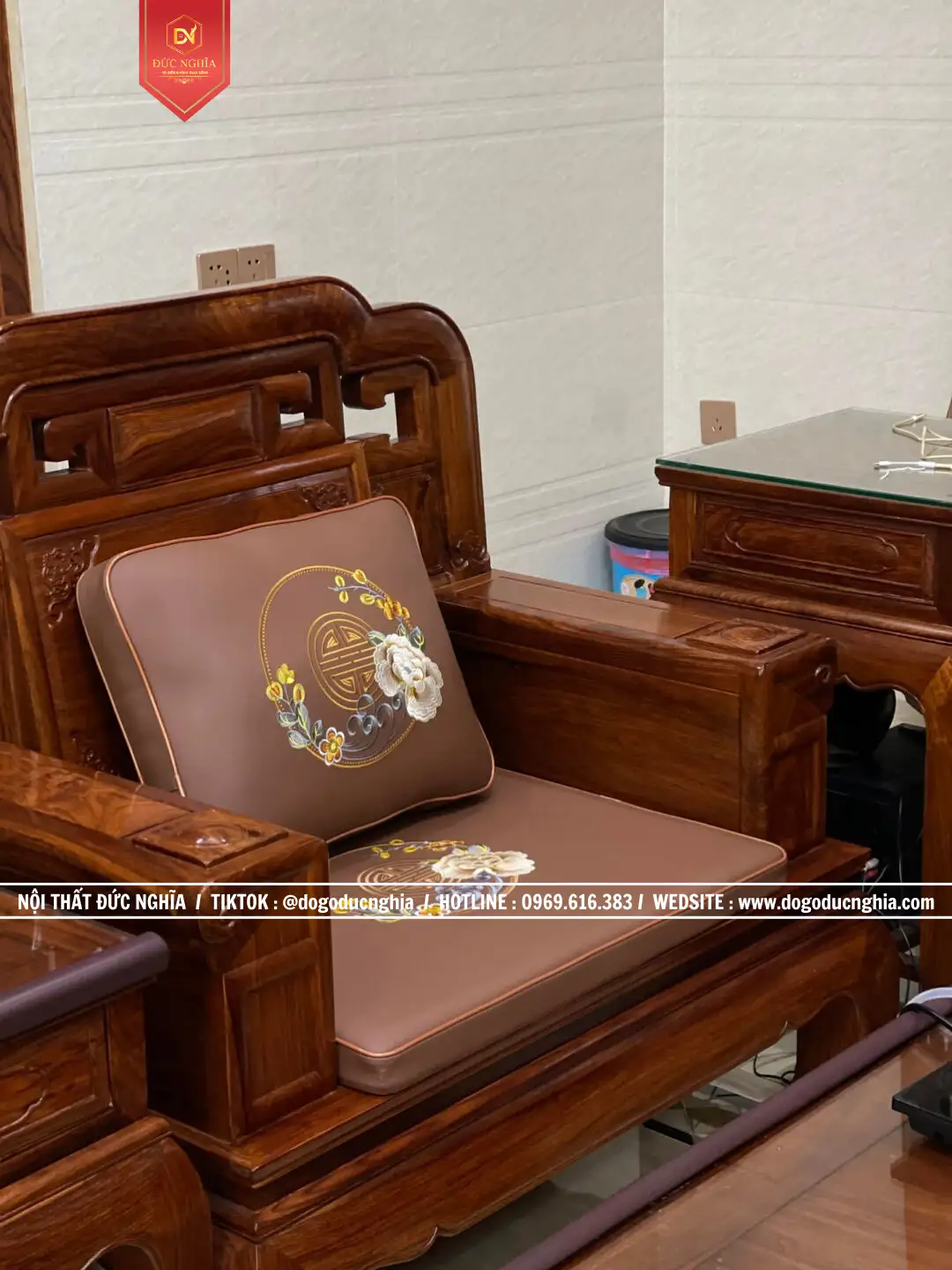Bên cạnh chất liệu gỗ cao cấp, sự phối hợp khéo léo giữa nệm da và gối tựa cũng tạo thêm điểm nhấn hiện đại cho không gian. Những chiếc đệm da cao cấp không chỉ mang đến sự thoải mái khi ngồi mà còn tăng thêm tính thẩm mỹ với gam màu trang nhã, đồng điệu với sắc gỗ chủ đạo. Các họa tiết được thêu tinh tế, tỉ mỉ trên gối ôm và đệm càng khiến tổng thể trở nên mềm mại, thanh lịch hơn. Sự kết hợp hài hòa giữa chất liệu gỗ tự nhiên ấm áp và da cao cấp sang trọng tạo nên một tổng thể cân bằng – vừa sang trọng, vừa gần gũi.