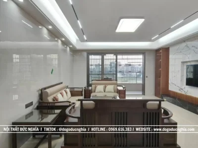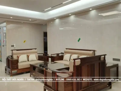 Thiết kế độc đáo phá cách này với mỗi chi tiết được chế tác thủ công, đáp ứng trọn vẹn gu thẩm mỹ tinh tế của chủ nhân, tạo nên dấu ấn độc bản, không thể trộn lẫn. Bộ sofa gỗ được thiết kế kê theo hình chữ U, tạo cảm giác quây quần, gần gũi nhưng vẫn gọn gàng và sang trọng. Tông màu chủ đạo là nâu trầm của gỗ gụ kết hợp với nệm vải nỉ màu kem, mang lại sự cân bằng nhẹ nhàng mà tinh tế.