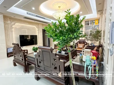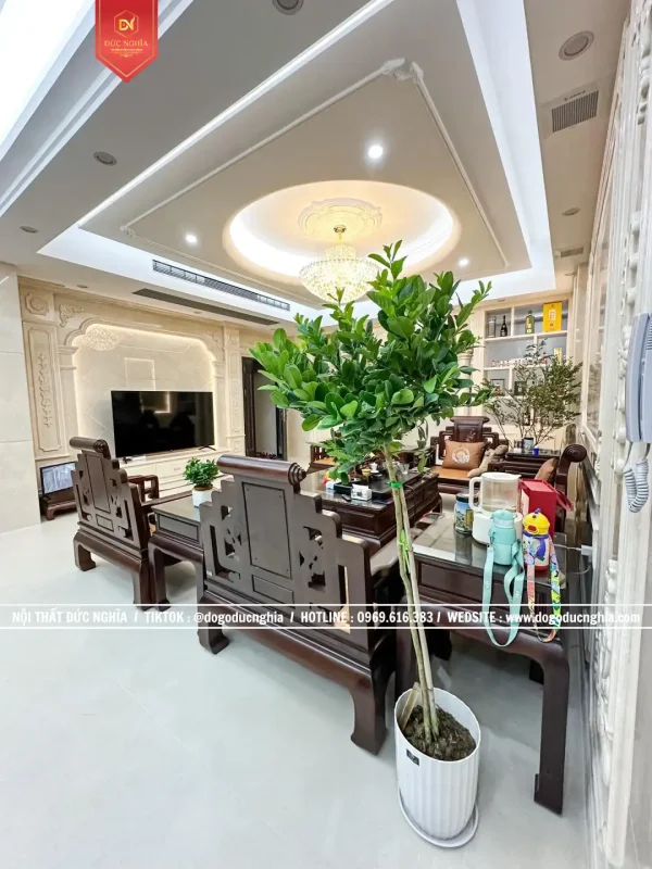 Bước vào không gian phòng khách, ta dễ dàng cảm nhận được sự tinh tế, sang trọng và ấm cúng toát lên từ từng chi tiết nội thất. Toàn bộ không gian được thiết kế hài hòa, kết hợp giữa phong cách cổ điển Á Đông và hơi thở hiện đại, mang lại cảm giác gần gũi mà vẫn đẳng cấp. Tâm điểm nổi bật nhất trong căn phòng chính là bộ ghế Sơn Thủy – Đại Phú Quý phiên bản mới nhất – một sản phẩm tâm huyết đến từ Nội thất Đức Nghĩa, được chế tác tỉ mỉ và cải tiến trong từng đường nét để đáp ứng thị hiếu của những gia chủ yêu thích sự sang trọng nhưng không cầu kỳ.