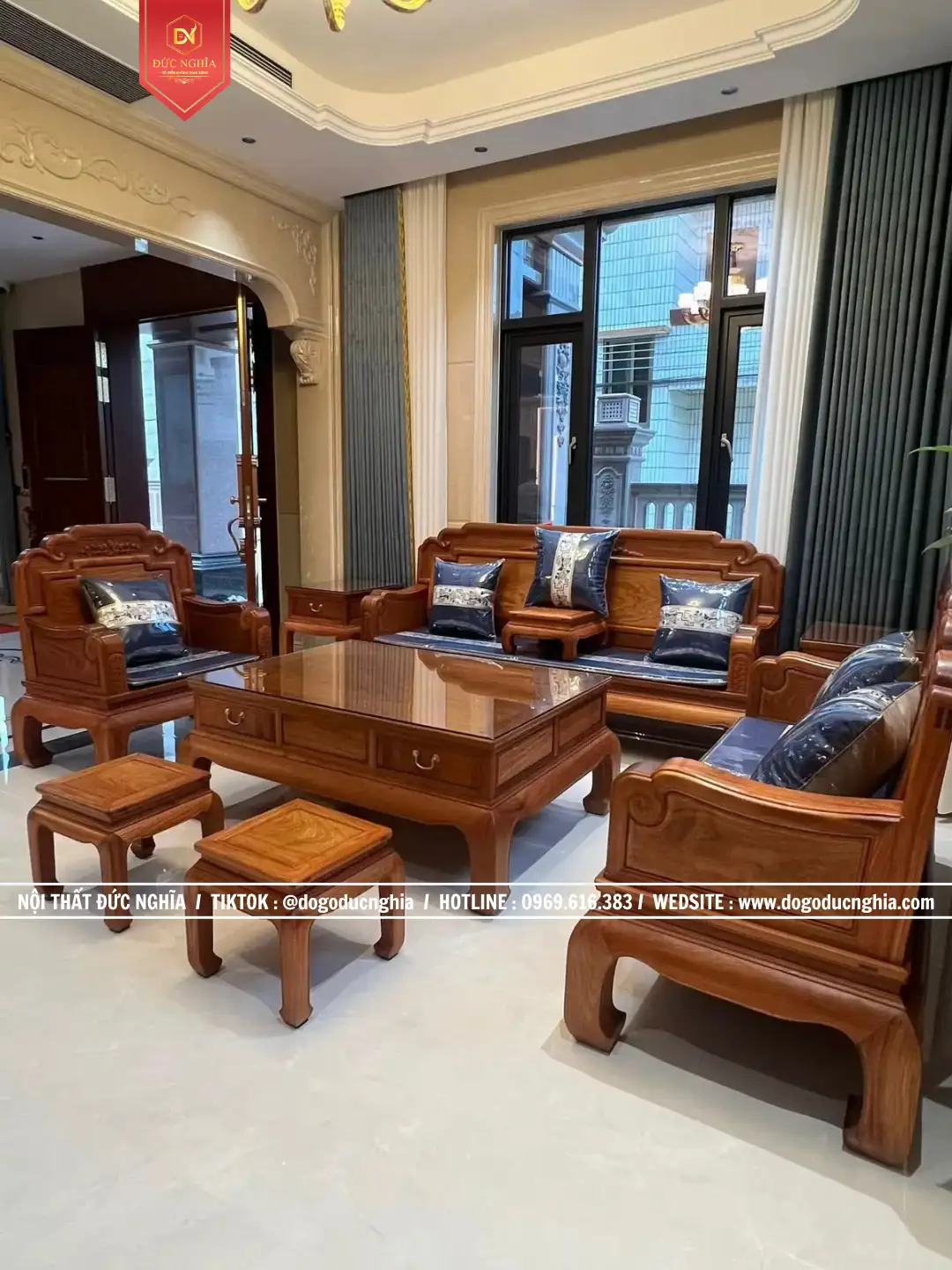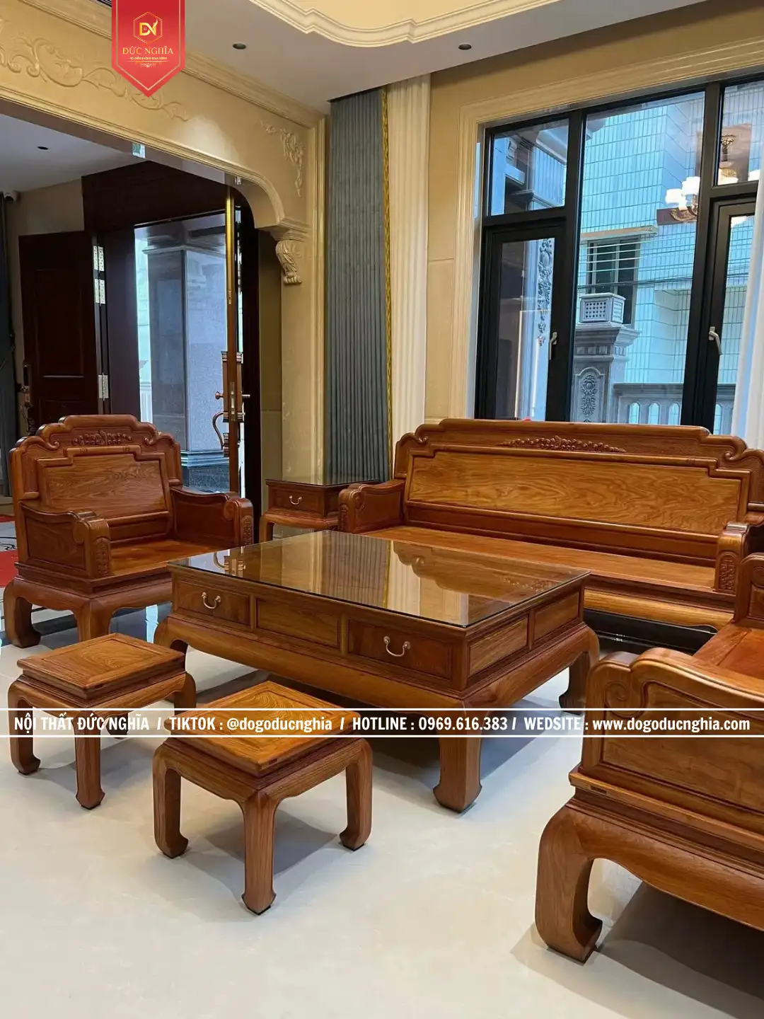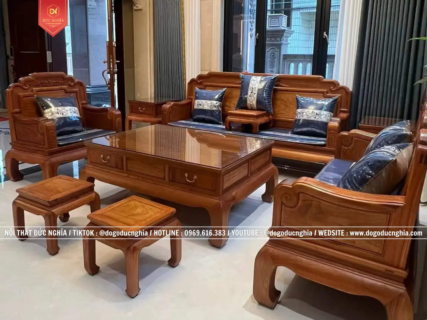 Bộ bàn ghế được thiết kế 9 món theo quy cách 1–2–3, với kích thước riêng được Cơ Sở Đức Nghĩa đo đạc và tư vấn để phù hợp với không gian phòng khách của gia đình. Cách bố trí theo hình chữ U không chỉ tạo nên sự cân đối và bề thế cho căn phòng mà còn mang lại cảm giác gần gũi, giúp mọi người dễ dàng kết nối khi quây quần bên nhau. Ở trung tâm là bàn trà gỗ tự nhiên, thiết kế vuông vắn, chắc chắn với các ngăn kéo tiện lợi, vừa mang tính thẩm mỹ vừa đáp ứng nhu cầu sử dụng trong sinh hoạt hàng ngày.