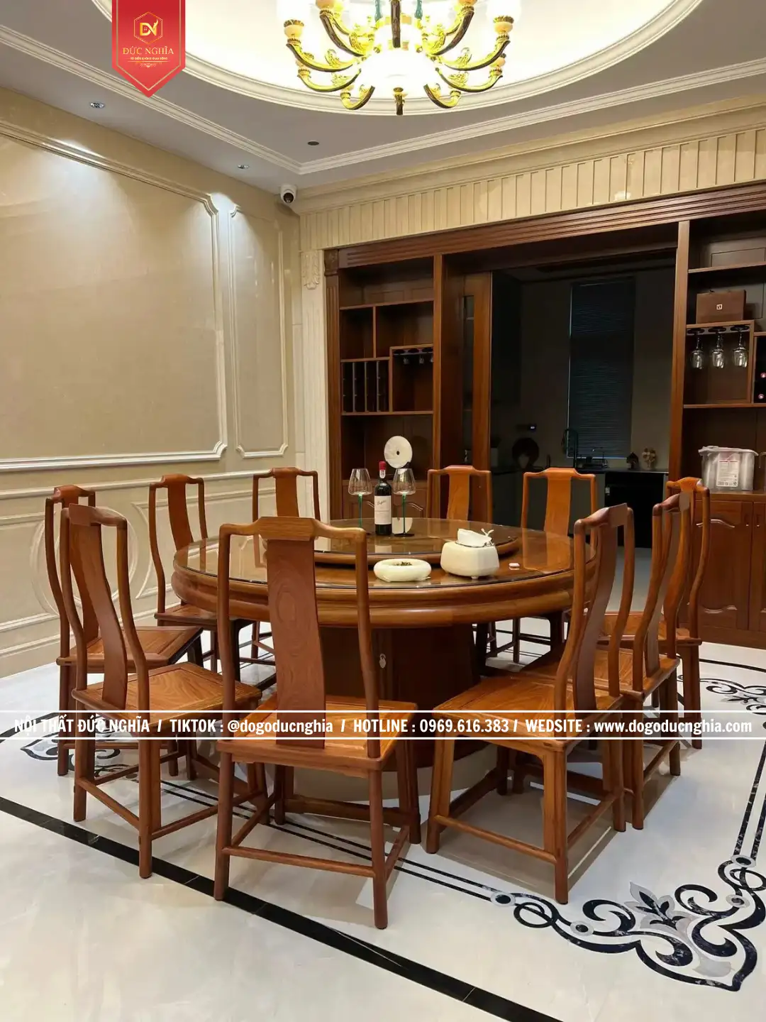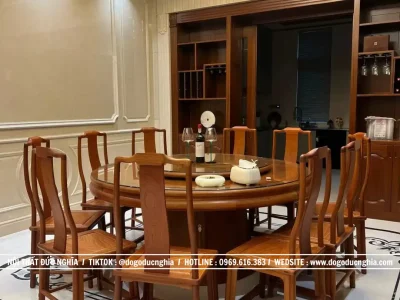Di chuyển sang khu vực phòng ăn, bộ bàn ghế ăn tròn bằng gỗ Hương mang lại cảm giác ấm cúng và thân mật. Bàn ăn tròn vốn mang ý nghĩa đoàn viên, tượng trưng cho sự sum vầy và gắn kết giữa các thành viên trong gia đình. Thiết kế 10 ghế và bạn rộng rãi có mâm xoay tiện lợi. Những chiếc ghế với phần tựa lưng uốn cong mềm mại được thiết kế vừa vặn, tạo sự thoải mái khi sử dụng. Trong ánh đèn ấm áp của phòng ăn, bộ bàn ghế gỗ tự nhiên như làm cho mỗi bữa cơm gia đình trở nên trọn vẹn và ý nghĩa hơn.