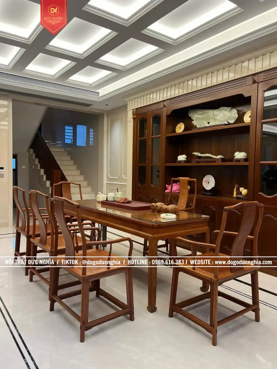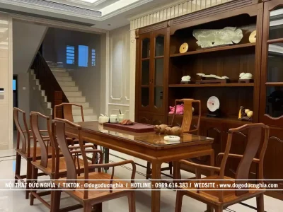 Có những không gian sống chỉ đơn thuần là nơi sinh hoạt, nhưng cũng có những không gian được chăm chút để trở thành nơi lưu giữ cảm xúc và giá trị của cả một gia đình. Trong công trình lần này, Cơ Sở Đồ Gỗ Đức Nghĩa đã hoàn thiện và bàn giao một tổng thể nội thất đồng bộ cho gia đình khách hàng, nơi mỗi món đồ không chỉ phục vụ công năng mà còn góp phần tạo nên một không gian sống có chiều sâu thẩm mỹ. Từ bộ bàn ghế Triện Tranh Cá Chép, kệ tivi, bộ bàn ghế ăn tròn, bàn trà cho đến bàn decor trang trí, tất cả hòa quyện với nhau tạo nên một tổng thể sang trọng, ấm cúng và đầy tinh tế.