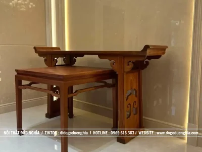 Toàn bộ các sản phẩm trong công trình lần này đều được Cơ Sở Đồ Gỗ Đức Nghĩa chế tác từ gỗ Hương cao cấp nhập khẩu, loại gỗ nổi tiếng với độ bền cao, màu sắc ấm áp và vân gỗ đẹp tự nhiên. Từng khối gỗ được tuyển chọn kỹ lưỡng trước khi đưa vào sản xuất, đảm bảo chất lượng tốt nhất cho sản phẩm. Các chi tiết được gia công tỉ mỉ, hoàn thiện cẩn thận bởi đội ngũ nghệ nhân lành nghề. Đặc biệt, toàn bộ kết cấu sản phẩm đều sử dụng 100% kỹ thuật mộng gỗ cổ truyền, đạt tiêu chuẩn xuất khẩu, giúp sản phẩm chắc chắn, bền bỉ và giữ được giá trị lâu dài theo thời gian.
