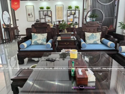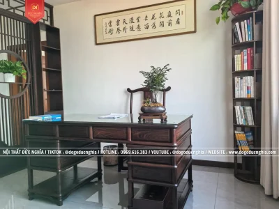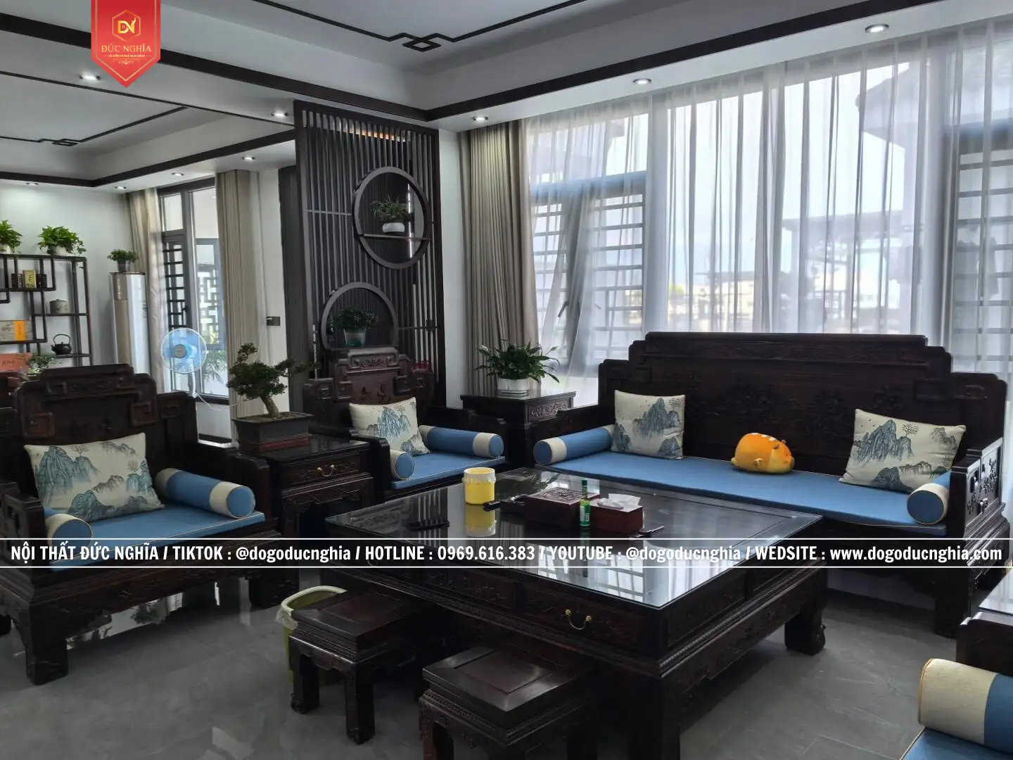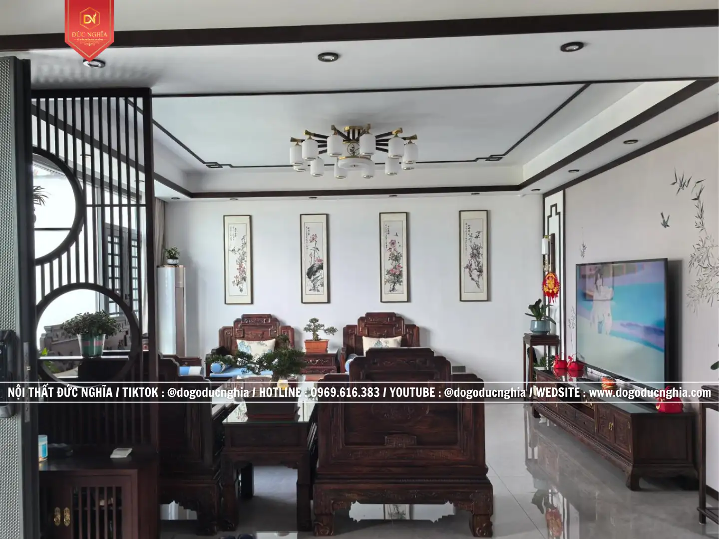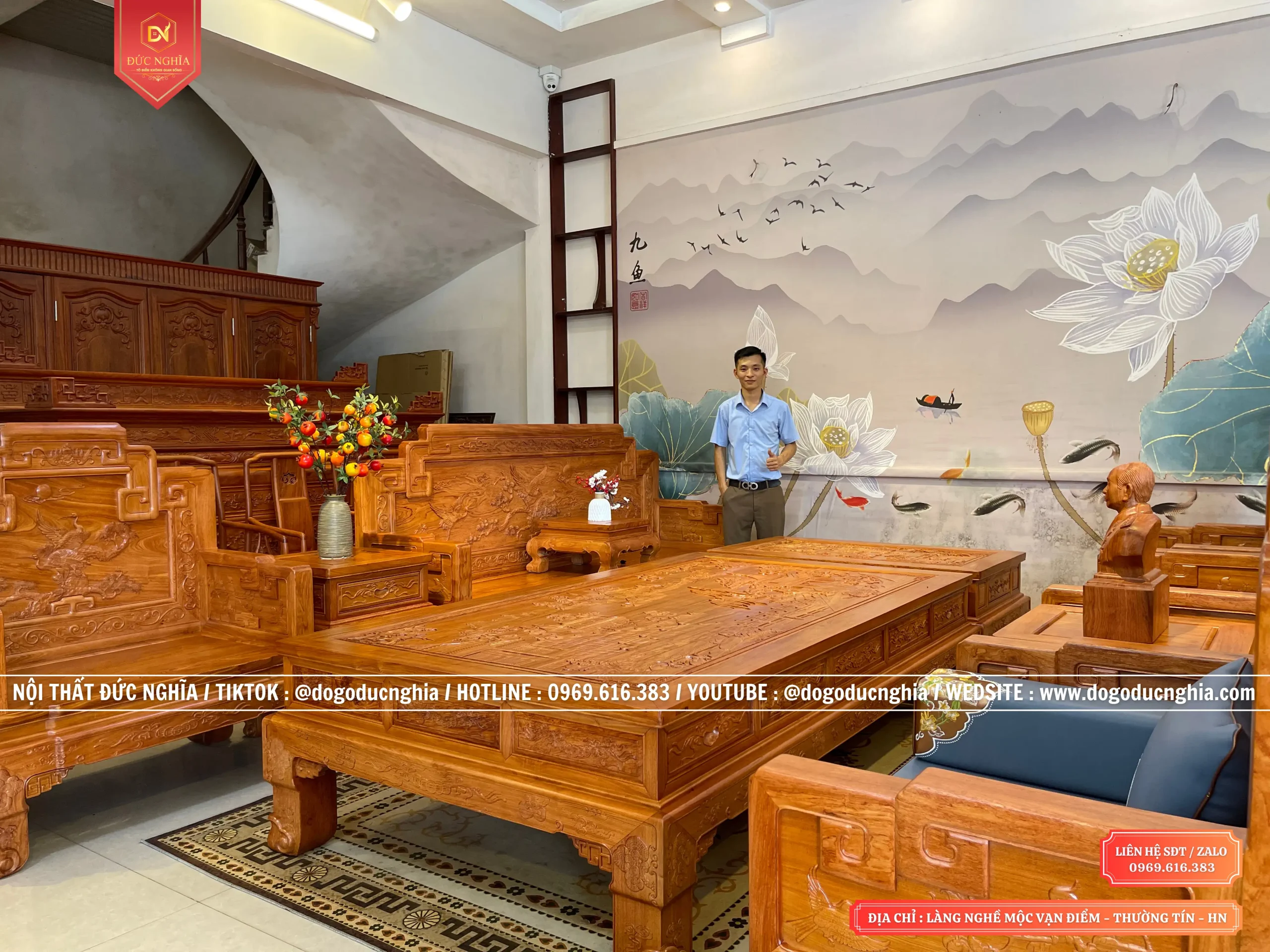 Combo nội thất Đức Nghĩa dành cho không gian gia đình gồm: Bộ bàn ghế phòng khách Triện Tranh Như Ý, Bộ bàn ghế ăn Triện 10 ghế (có mâm xoay), Kệ tivi, Bàn làm việc, Bàn trang trí — toàn bộ chế tác từ gỗ mun hoa Lào quý hiếm. Sản phẩm nổi bật ở kiểu dáng cổ điển thượng lưu, đường nét chạm khắc tinh xảo, kỹ thuật mộng gỗ cổ truyền đạt tiêu chuẩn xuất khẩu, đảm bảo độ bền và giá trị vượt trội so với nội thất đóng bằng đinh-vít thông thường.