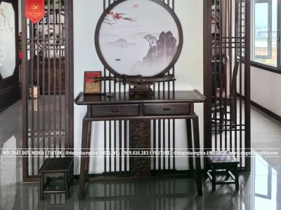 Kiểu dáng: Nhỏ gọn, chân mỏng, bề mặt chạm triện hoặc họa tiết đối xứng, phù hợp đặt lối vào, hành lang, góc phòng.