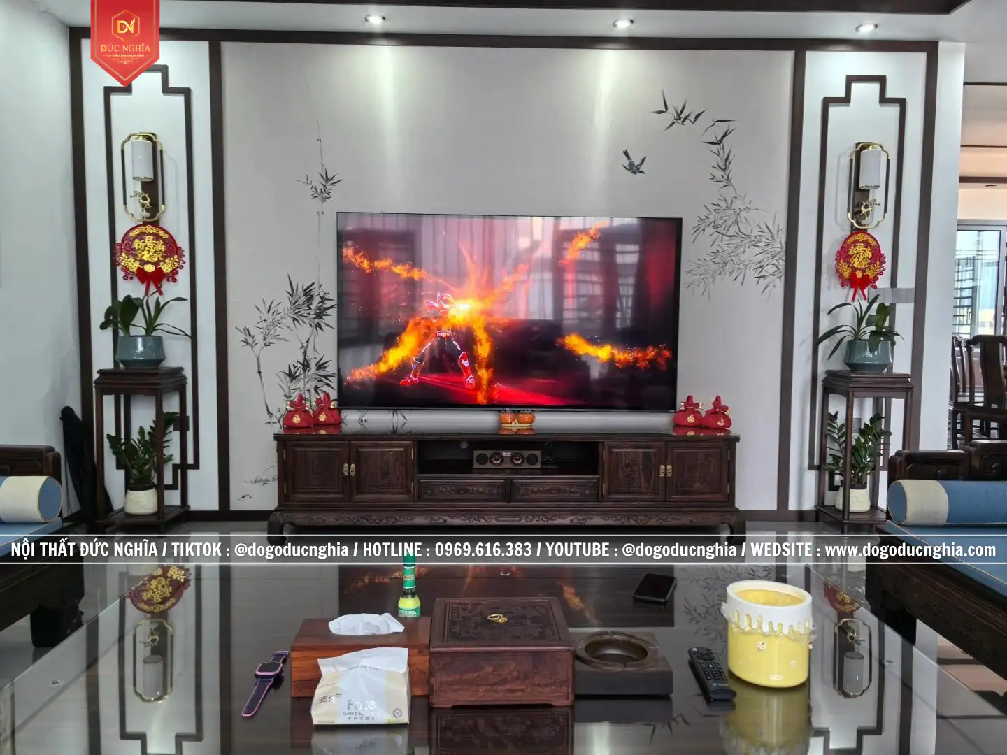 Kiểu dáng & đường nét: Tỷ lệ cân đối với tường phòng khách hiện, ngăn kéo và khoang để thiết bị âm thanh thiết kế tiện lợi. Mặt trên phẳng chịu tải, dáng chân cao thanh thoát. Họa tiết Triện được chạm khắc đồng bộ với bàn ghế phòng khách.
