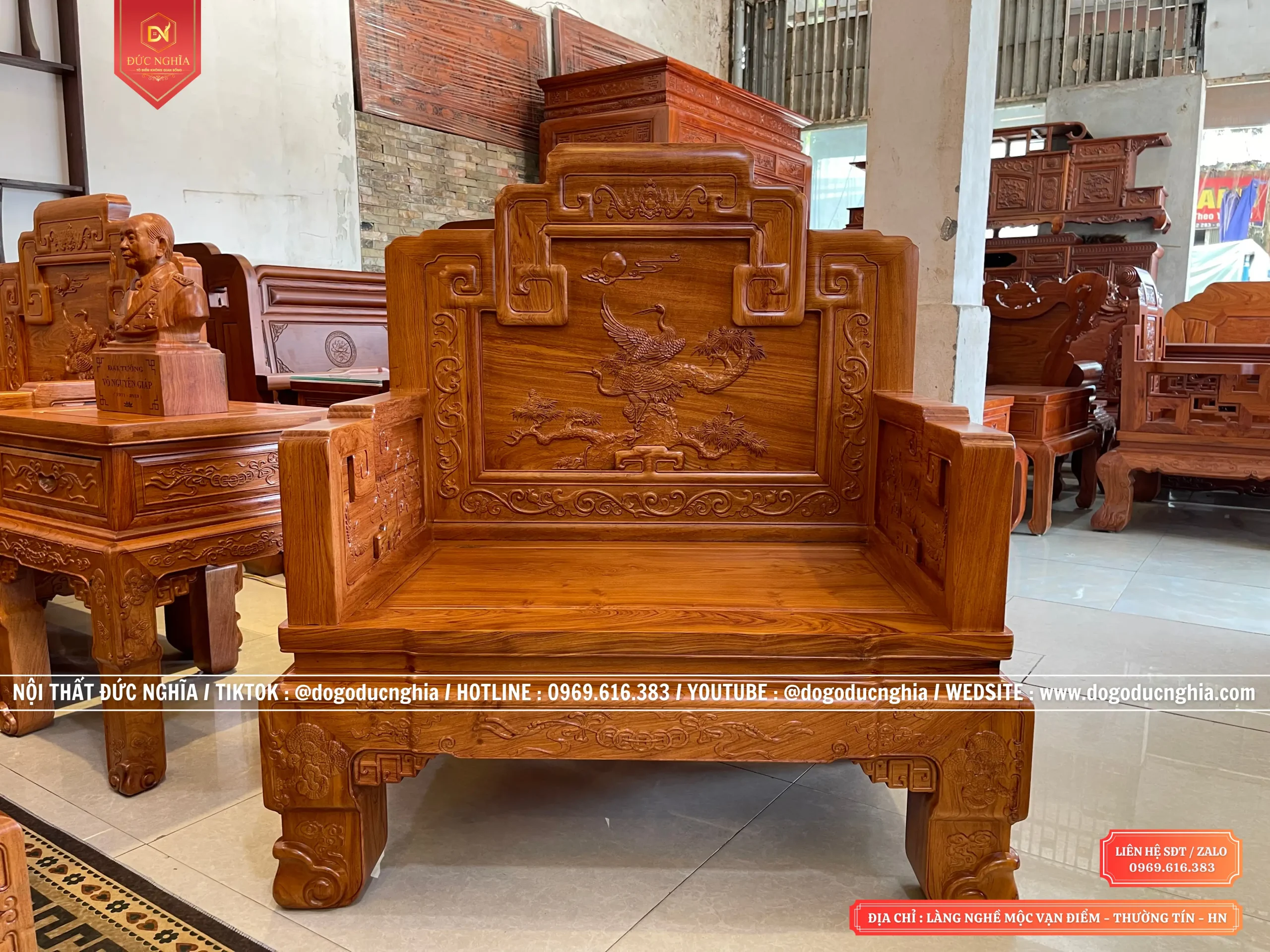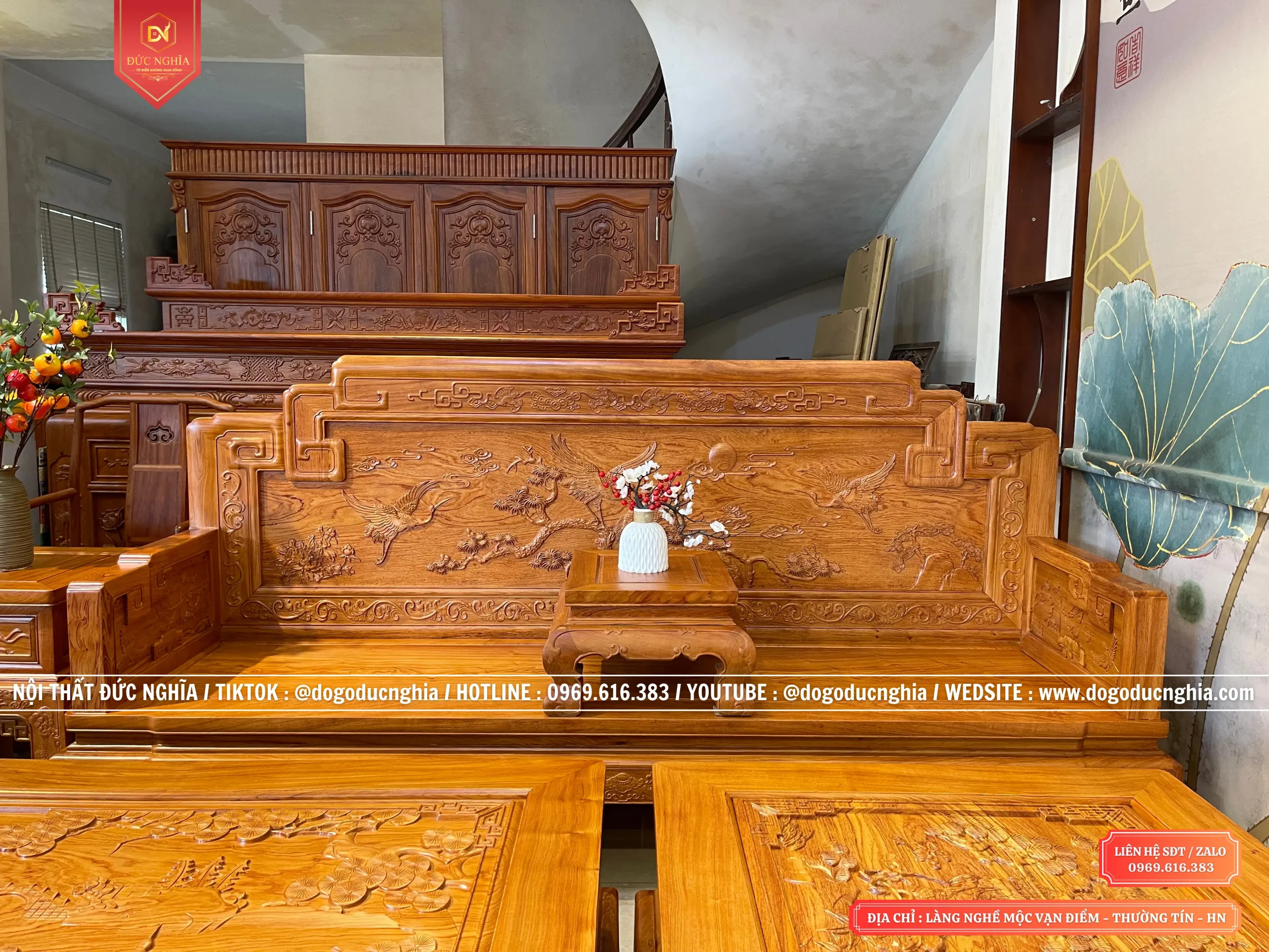 Bộ ghế Triên Tranh Tùng Hạc Diên Niên Gỗ Hương 10 Món, kích thước chân 14. Phù hợp với không gian phòng khách từ 35m2