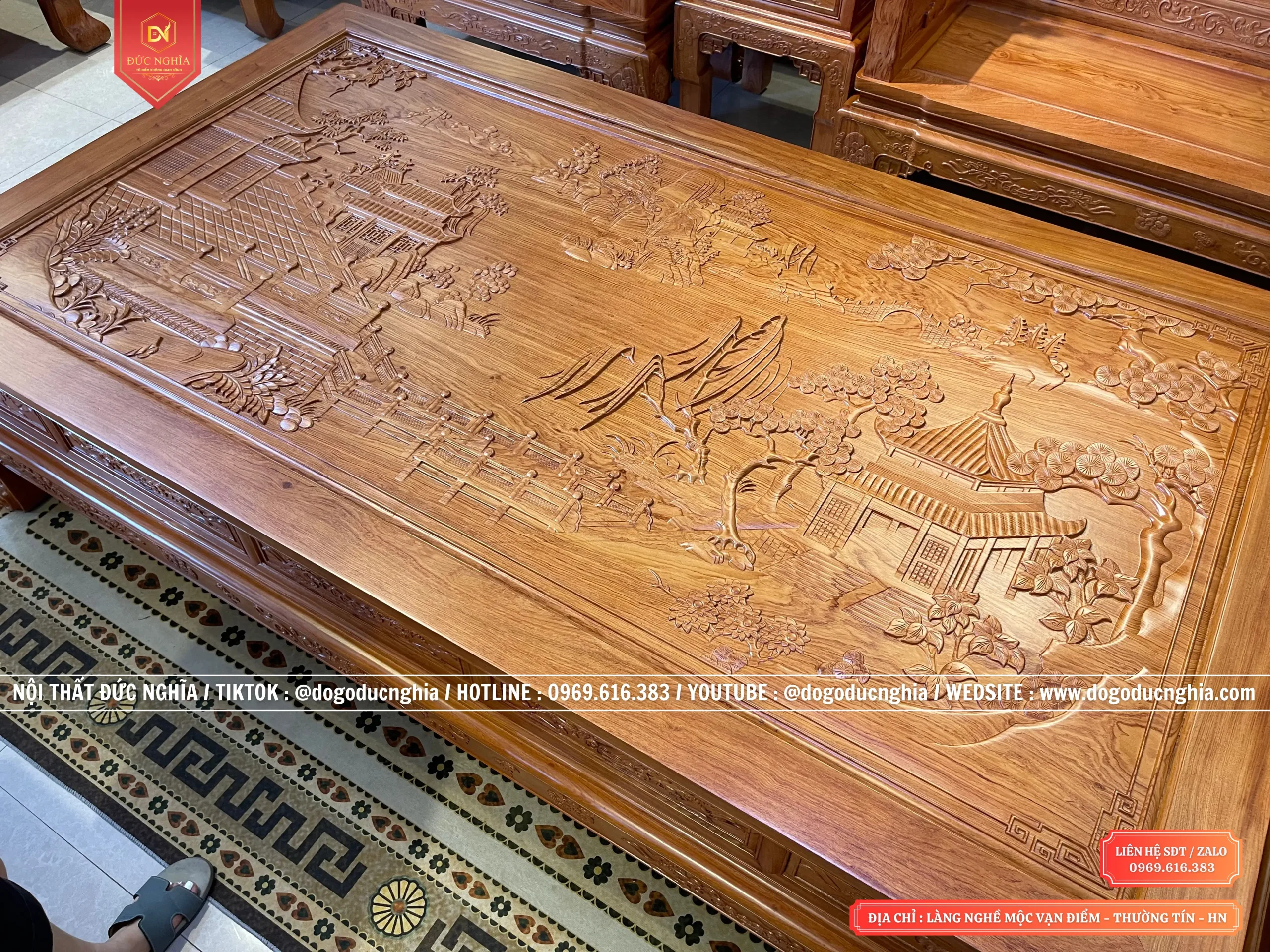 Một chiếc bàn lớn được đặt ở trung tâm bộ sản phẩm, một bức tranh Phong cảnh hữu tình được chạm khắc nổi bật trên mặt ván. Với những họa tiết được hoàn thiện trau truốt, tỉ mỉ. Bức tranh phong cảnh với cây cối, hoa lá xa xa là những mái nhà. Một bức tranh không chỉ đẹp mắt mà còn mang đến cảm giác thanh cảnh, nhẹ nhàng như hòa mình với thiên nhiên mỗi khi gia chủ ngắm nhìn.