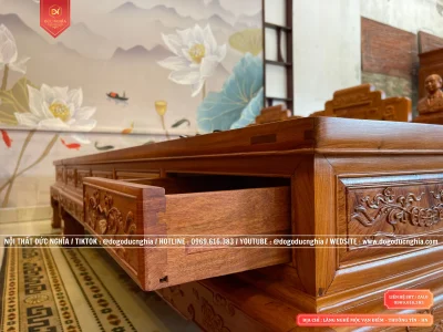Xung quanh bàn, được cơ sở thiết kế những chiếc ngăn kéo tiện lợi, để gia chủ có thể cất những vật dụng cần thiết. Dù là chi tiết nhỏ những vẫn được kết cấu bằng mộng gỗ chắc chắn vào hoàn thiện rất kĩ càng.