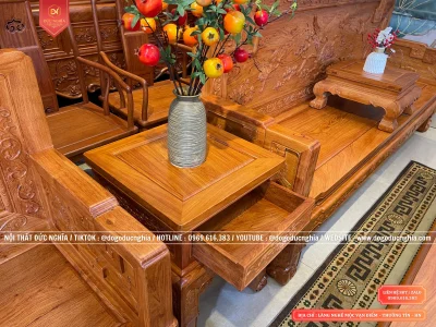 Chiếc đôn kẹp được bố trí giữa những chiếc ghế dùng để trang trí những lọ hoa, tượng gỗ, đá phong thủy hay vật dụng lưu niệm để trang hoàng cho không gian phòng thêm phần lộng lẫy, sang trọng … tùy thuộc vào sở thích của mỗi gia đình. Bên dưới có ngăn kéo tiện lợi.