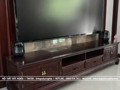 Trên các cánh tủ, họa tiết hoa sen được chạm khắc đơn giản nhưng đầy tinh tế. Hoa sen – biểu tượng của sự thuần khiết, thanh cao và bình an – không chỉ mang giá trị thẩm mỹ mà còn thể hiện chiều sâu văn hóa và triết lý sống hướng đến sự an yên, hài hòa. Những chi tiết chạm khắc vừa đủ, không phô trương, giúp tổng thể kệ tivi trở nên sang trọng mà vẫn giữ được nét trang nhã cần có.