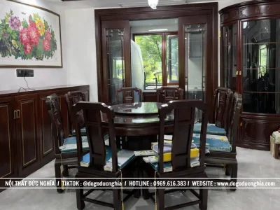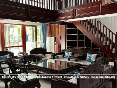 Không gian nội thất bàn ghế hiện đại được giới thiệu dưới đây là sự hòa quyện tinh tế giữa vẻ đẹp truyền thống và hơi thở hiện đại, toát lên nét sang trọng, ấm cúng nhờ việc sử dụng chất liệu gỗ Hương tự nhiên, được xử lý kỹ lưỡng và phun màu nâu trầm sâu lắng. Gam màu này không chỉ giúp tôn vân gỗ tự nhiên một cách rõ nét mà còn mang lại cảm giác gần gũi, bền vững theo thời gian, đồng thời tạo nên chiều sâu và sự đẳng cấp cho toàn bộ không gian sống.