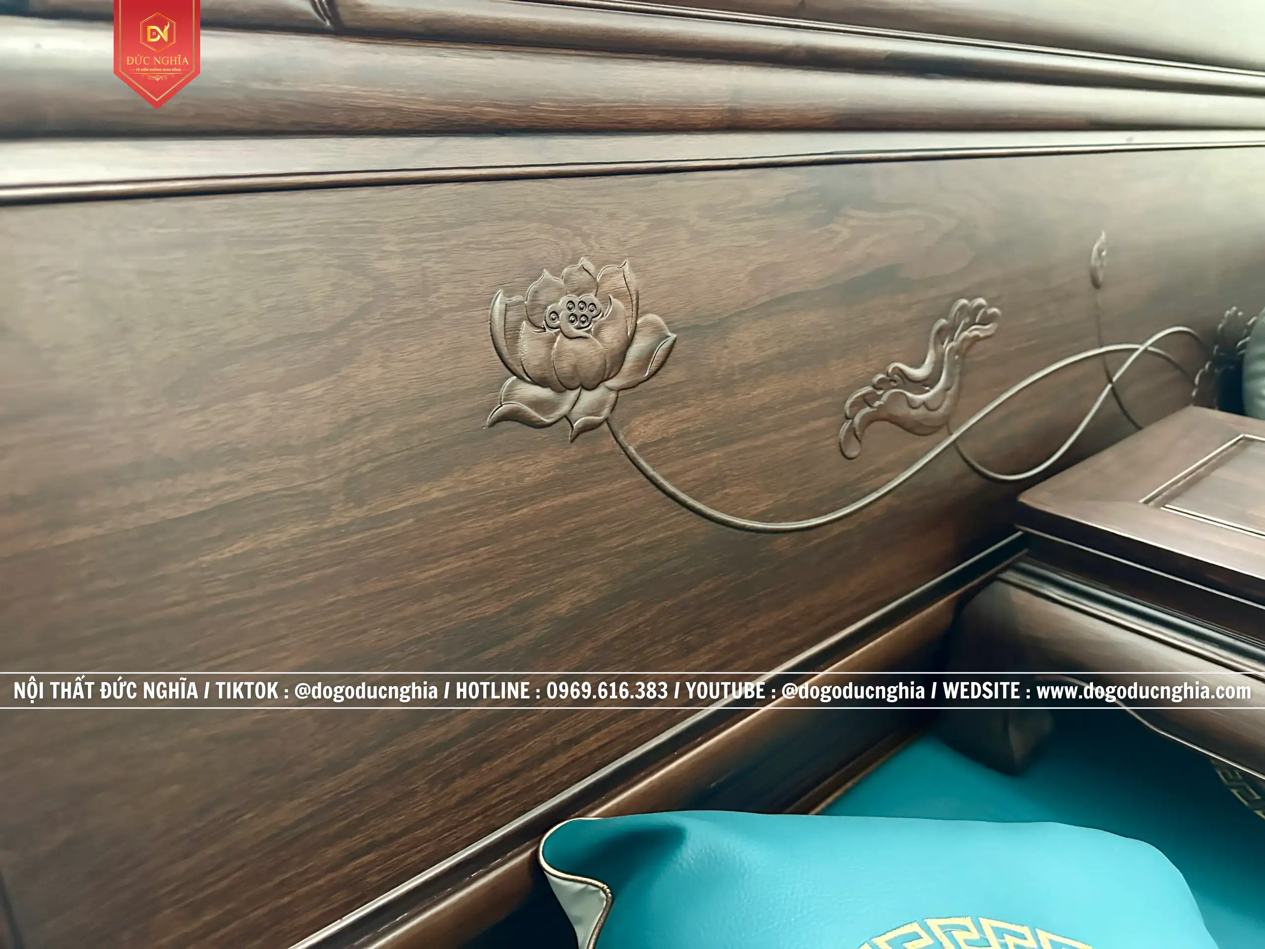 Bông sen mang đến sự bình an, thanh lọc năng lượng xấu. Tượng trưng cho tâm hồn cao thượng, thuần khiết và trí tuệ. Hoa Sen được khắc họa tỉ mỉ với độ nông sâu uyển chuyển trên phần vách tựa của bộ ghế gợi lên cho ta cảm nhận như sen đang nở trong đầm, vươn mình thanh cao, biểu tượng của sự thanh tịnh, trí tuệ, giác ngộ tạo cho ta cảm giác như đang được hòa mình vào với thiên nhiên.